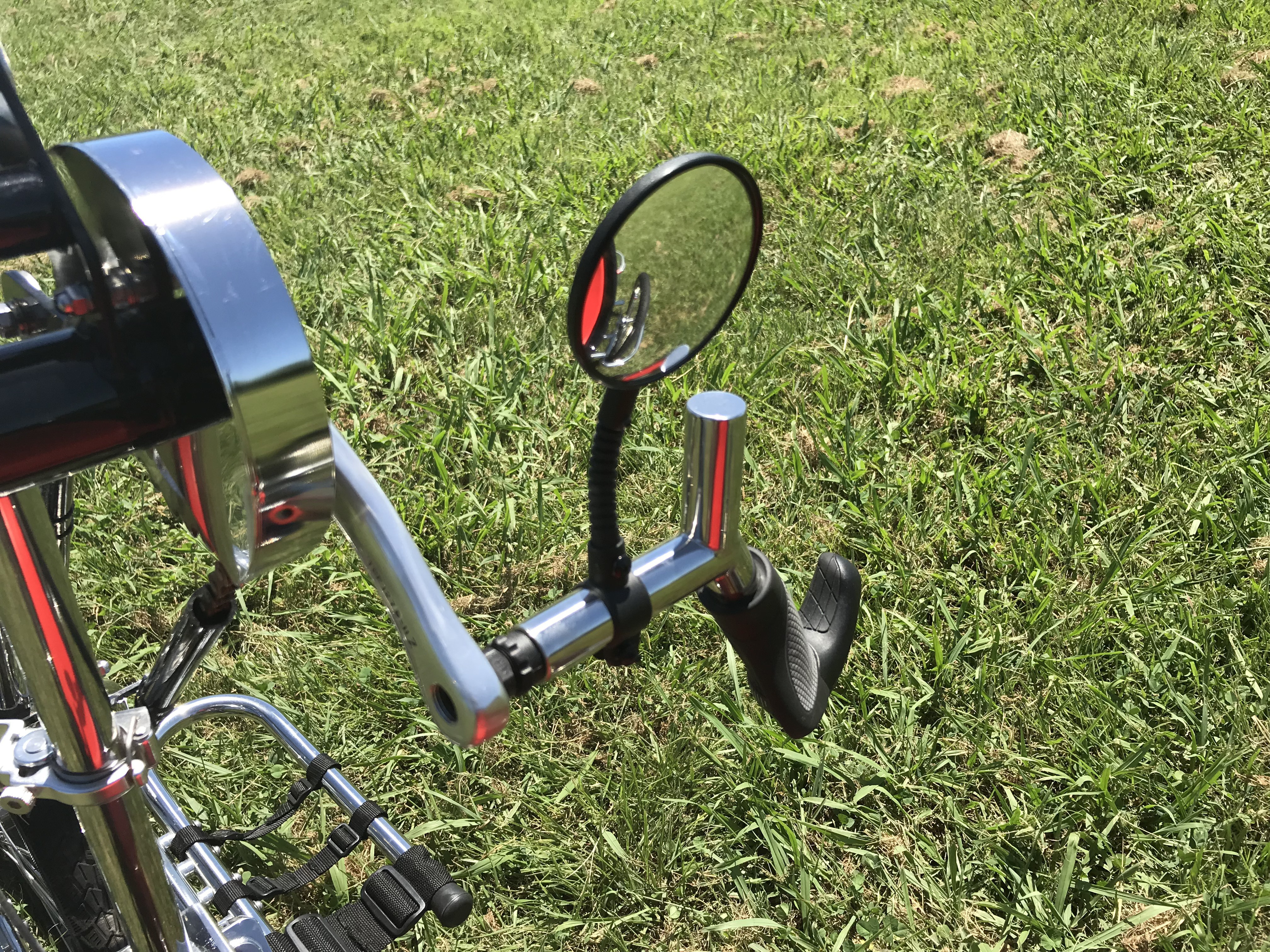 ハンドバイクに乗りながら後ろの様子を見ることができるサイドミラーです。ご希望の場所に取り付ける事が出来ます。