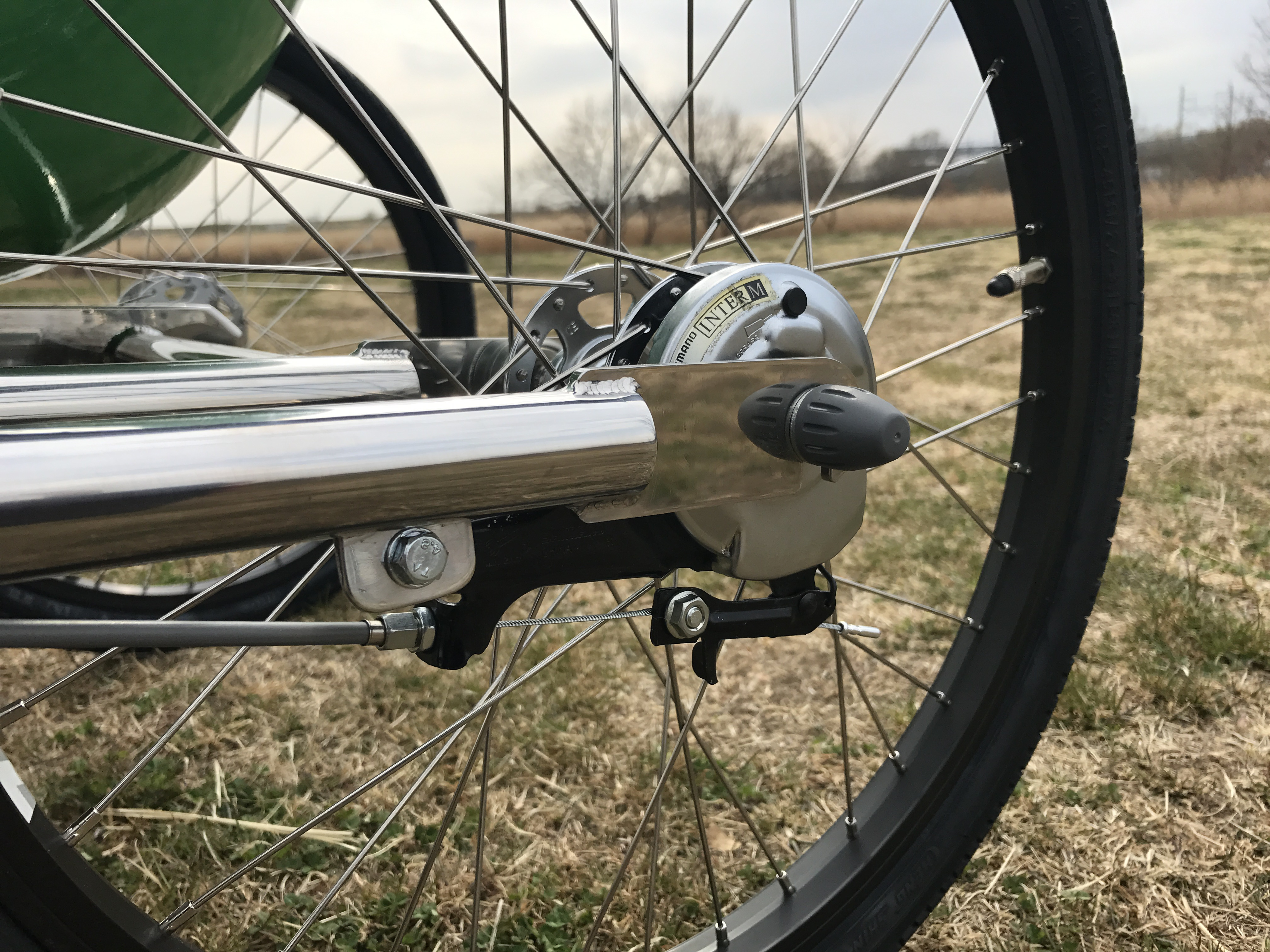 SHIMANO社製のコースタブレーキハブを前輪に採用。クランクを前に回すと前進し、後ろに回すとブレーキがかるという非常にシンプルな操作性なので、どなたでも乗りこなせます。